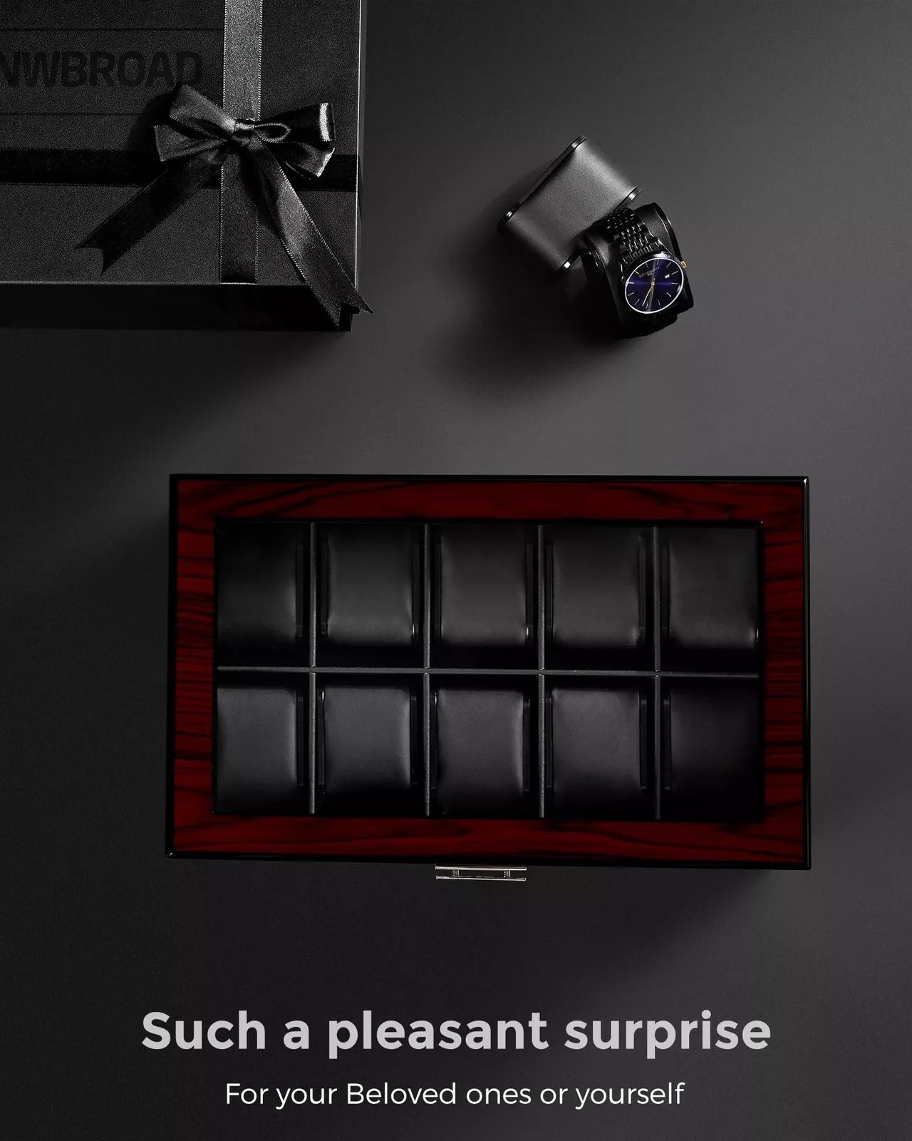 ATTRACTIVE WATCH BOXES:The watch box's sleek and sophisticated design adds a touch of luxury to your watch collection, The wood grain and piano lacquer craftsmanship and super quality soft PU lining make it look luxurious and charming.The beautiful hardware buckle makes it more exquisite
