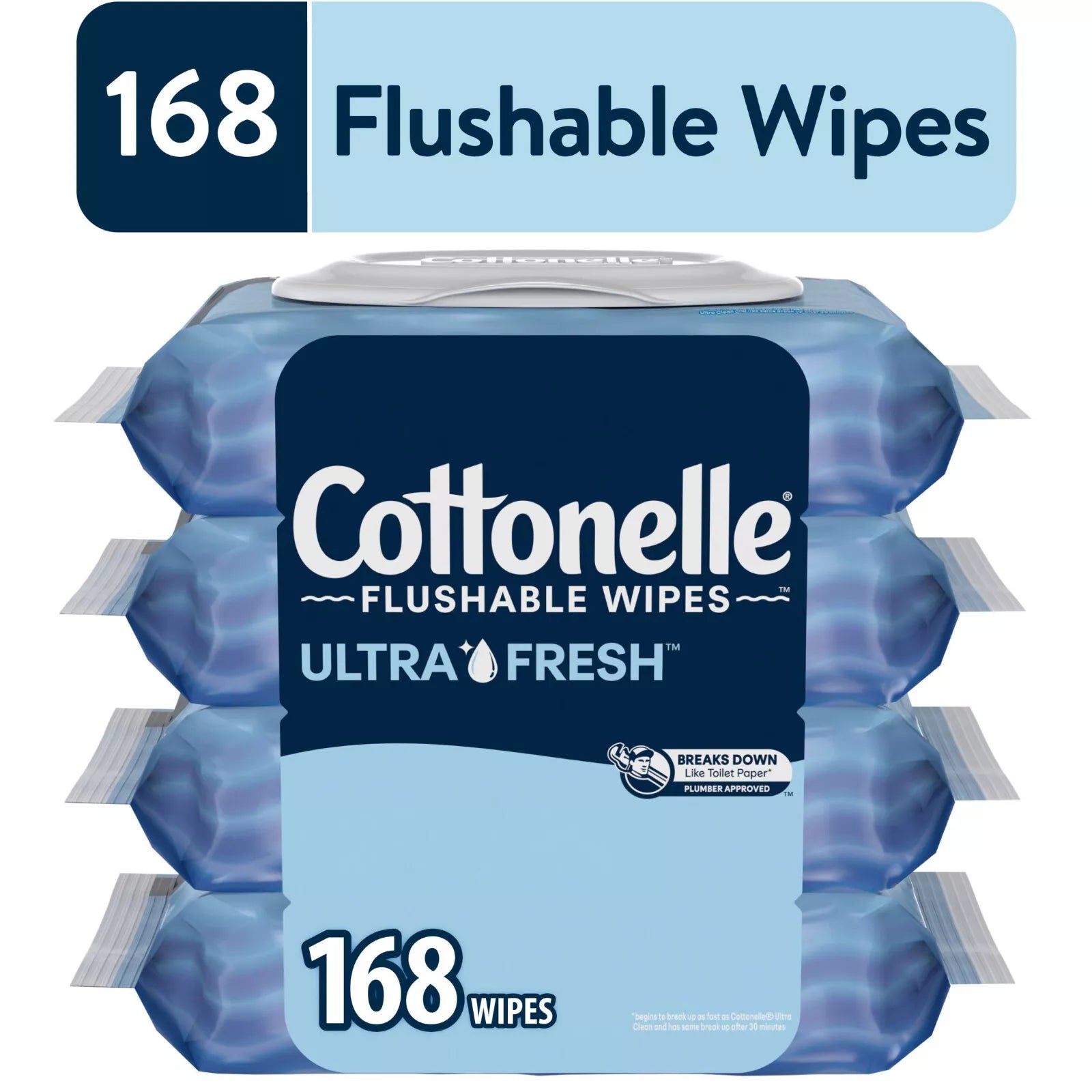 - 4 flip-top packs of Cottonelle Ultra Fresh Flushable Wet Wipes, 42 flushable wipes per pack; Cottonelle flushable wipes packaging and product may vary